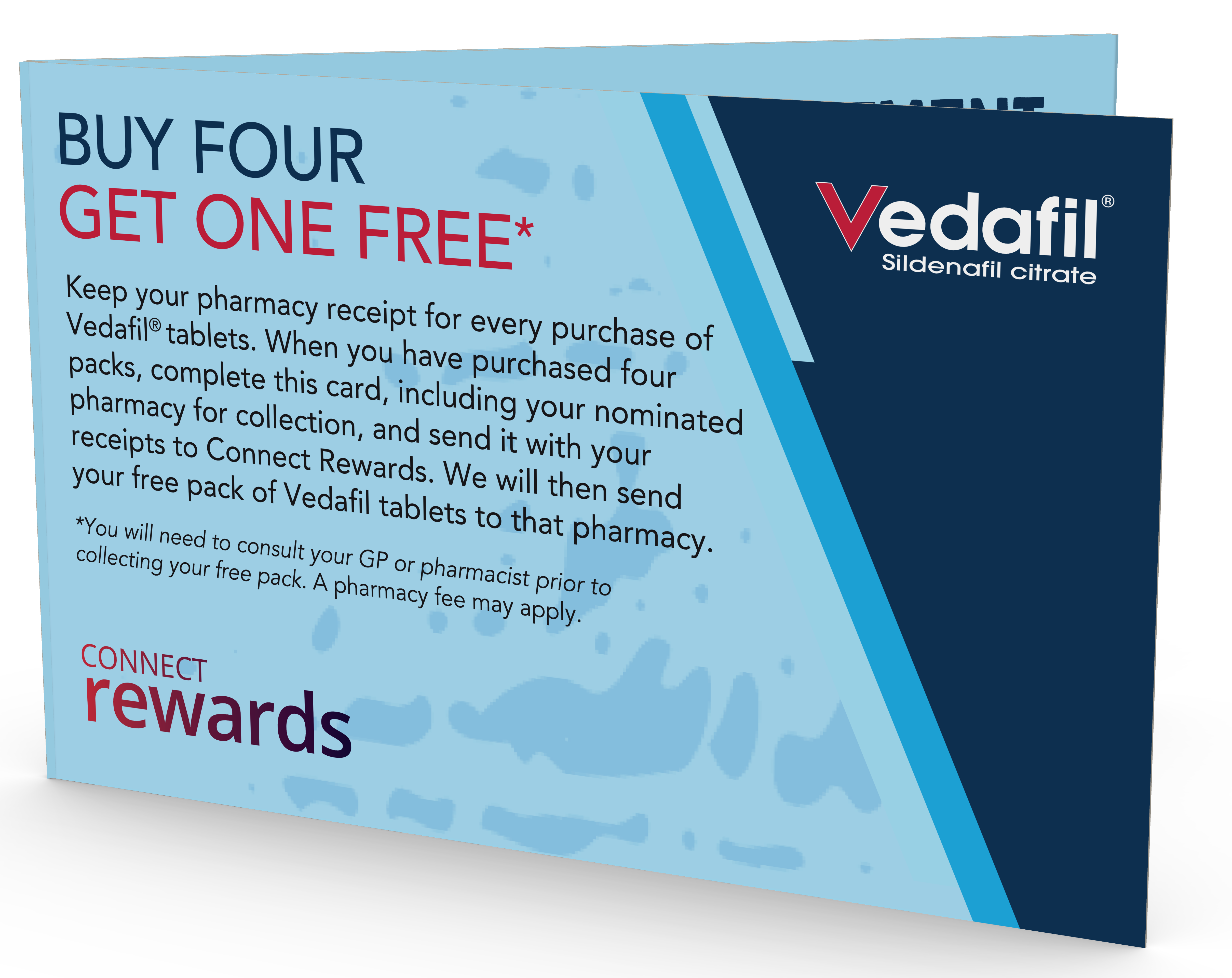 Keep your pharmacy receipt for every purchase of Vedafil. When you have purchased four packs, complete your Connect Rewards card, including your nominated pharmacy for collection, and send it with your receipts to Connect Rewards.